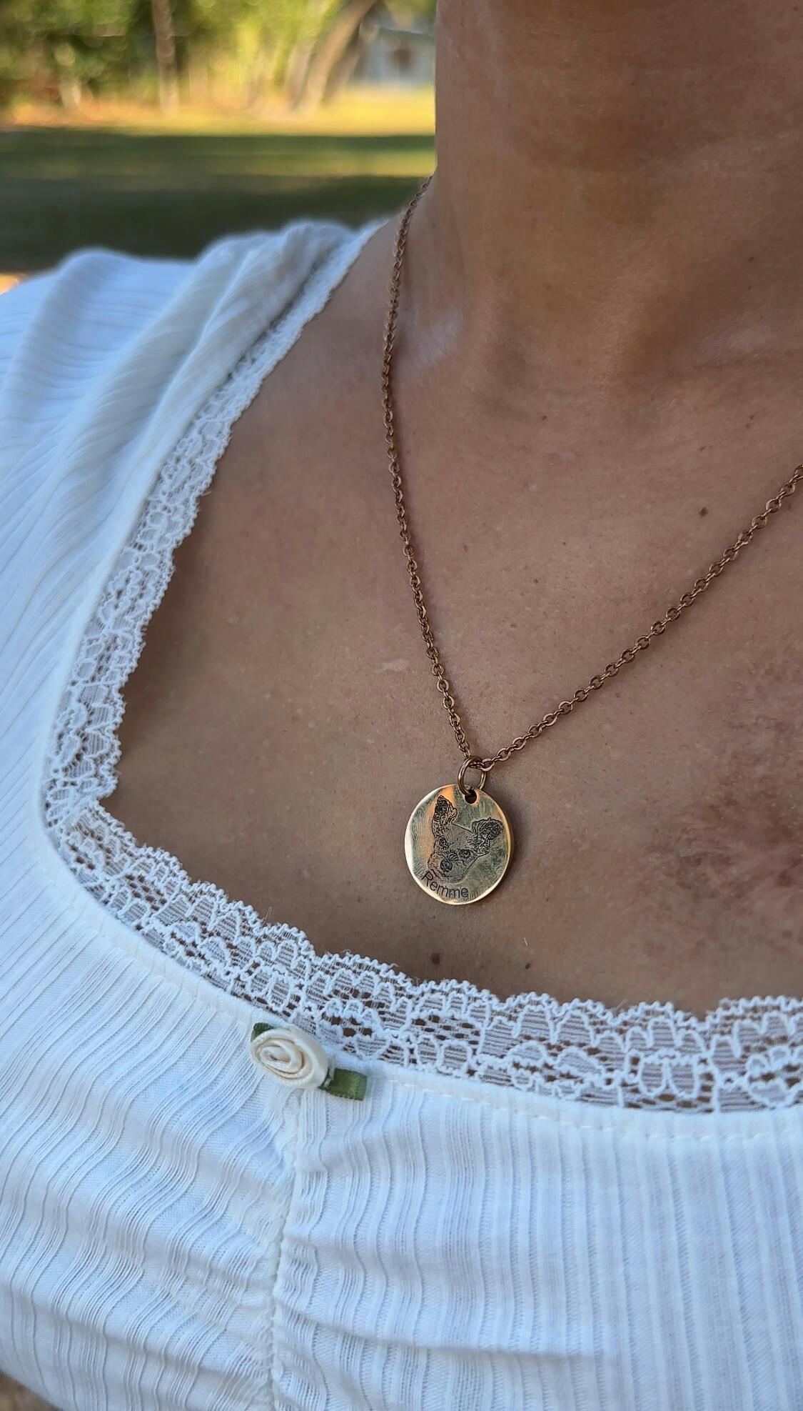 This necklace means everything to me. Remme is my little shadow—she’s been with me through so many seasons of life, always by my side with those soulful eyes and scruffy little face that just melts me. The moment I saw the engraving, I gasped. It looks exactly like her. Every tiny detail was captured with such love and care.
